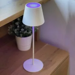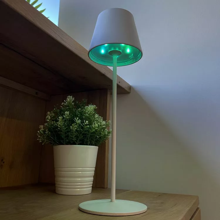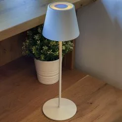 LAMPE DE TABLE LED MULTICOLORE :Kelly RGB est une lampe de table LED sans fil avec une base LED blanc chaud Ă intensitĂ© variable et multicolore. Cette lampe Ă poser se distingue par son design sobre et Ă©lĂ©gant mais Ă©galement par sa grande autonomie de fonctionnement (jusqu’Ă 12 heures). Lampe Ă poser autonome, elle apportera Ă votre dĂ©coration une touche chic et tendance. Elle est idĂ©ale comme lampe de table design, lampe de chevet ou encore pour illuminer vos tables de fĂŞtes grâce Ă sa lumière blanche Ă©lĂ©gante et son cĂ´tĂ© fun multicolore.