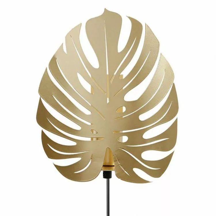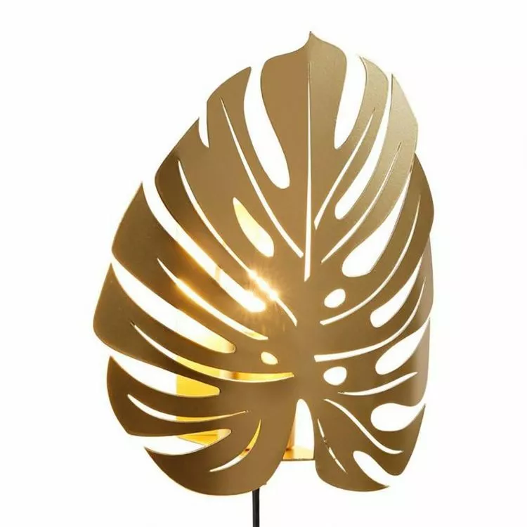 Applique métal Moana doréeCréez une atmosphère lumineuse pratique et moderne grâce à l’applique en métal Moana dorée. Cette applique originale en forme de feuille apportera du renouveau à votre éclairage avec son look contemporain.Informations sur l’applique métal Moana dorée :Composition : métalDimensions : 20,5 x 24 cmDouille : E27 Max. 40W (ampoule non fournie)Avec interrupteur et prise