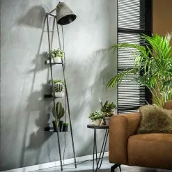 L 50 x P 50 x H 186 cm. Longueur du cordon : 425 cm. Luminaire industriel avec 3 étagères. Métal gris effet vieilli. Garantie 2 ans + 1 an NOUVO MEUBLE. Fabrication européenne