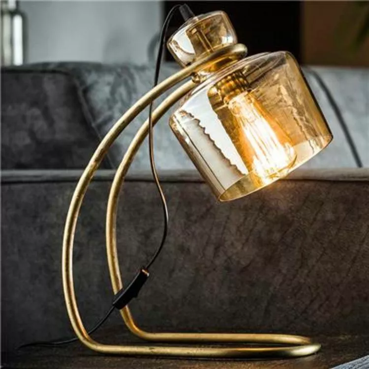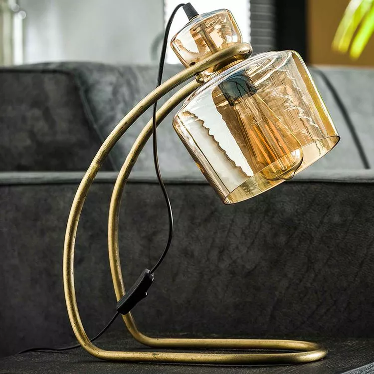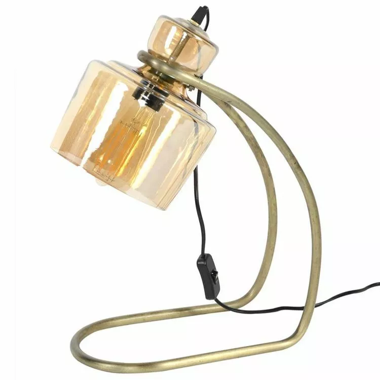 L 32 x P 18 x H 45 cm. Longueur du cordon : 120 cm. Luminaire à poser en verre ambré et métal finition doré.Garantie 2 ans + 1 an NOUVO MEUBLE. Fabrication de qualité européenne.